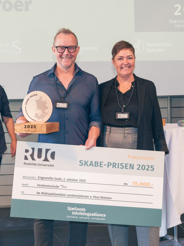 Camilla Schmidt, prodekan for uddannelse på Institut for Mennesker og teknologi ved Roskilde Universitet, overrakte årets SKABE-PRIS og en donation på 15.000 kr. – på vegne af Hanne Leth Andersen – til til Poul Bøje Nielsen for De Midtsjællandske Landevejskroer.